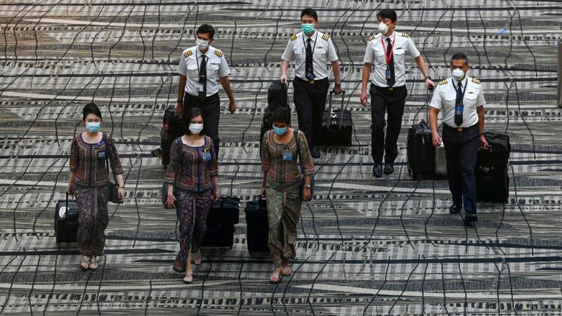 Singapore Airlines crew member walk along the transit hall of Changi International Airport terminal in Singapore on January 14, 2021. Roslan RAHMAN / AFP
