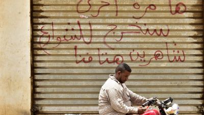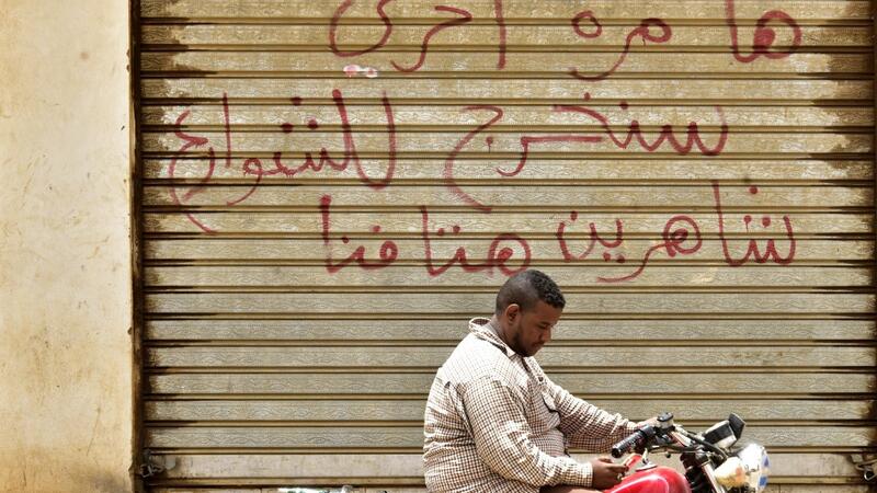 A Sudanese man sits on a motorbike in front of a closed photo studio in Khartoum on June 9, 2019. Arabic writing on the shutters of the closed shop reads: "Another time, we shall take to the streets, crying out our demands loudly." (AFP/ File Photo)