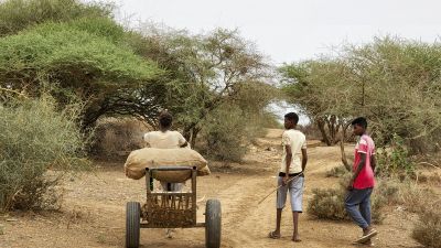 Children transport harvested onions in the village of al-Jaberab west of Shendi in Sudan on August 30, 2023. (Photo by AFP)