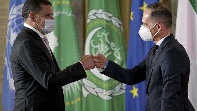 German Foreign Minister Heiko Maas (R) welcomes Libyan Prime Minister Abdul Hamid Dbeibah for the Second Berlin Conference on peace in Libya at the German Foreign Ministry in Berlin on June 23, 2021. Michael Sohn / POOL / AFP