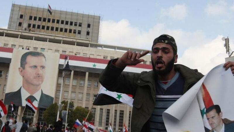 In central Damascus, tens of thousands gathered, waving flags of Syria and portraits of the president.