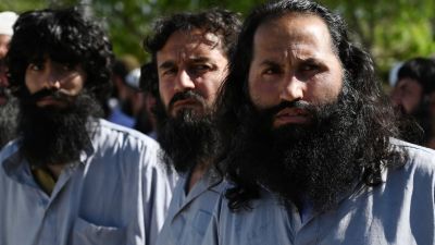 Taliban prisoners stand during their release from the Bagram prison, next to the US military base in Bagram, some 50 km north of Kabul on May 26, 2020. Afghan authorities plan to release 900 more Taliban prisoners on May 26, as calls grow for the militants to extend a ceasefire on its third and final day. WAKIL KOHSAR / AFP