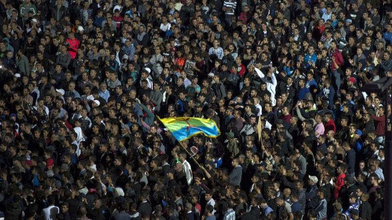 Protesters wave the Amazigh (Berber) flag as they shout slogans in the northern city of Al Hoceima on October 30, 2016, following the death of fishmonger Mouhcine Fikri, who was crushed to death on October 28 in a rubbish truck in Al Hoceima. (AFP/Fadel Senna)