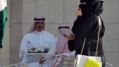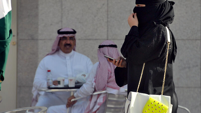 A Saudi woman holds her mobile as she walks through a coffee shop in the capital Riyadh on June 17, 2013. (Source: AFP/ FAYEZ NURELDINE)
