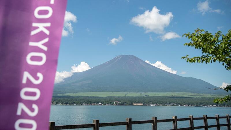 This general view shows Mount Fuji, Japan's highest mountain at 3,776 meters (12,388 feet), seen from Lake Yamanaka, next to a Tokyo 2020 Olympics banner on July 19, 2021. Charly TRIBALLEAU / AFP