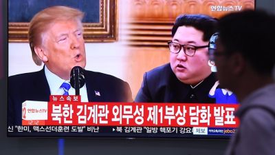 A man walks past a television news screen showing North Korean leader Kim Jong Un and US President Donald Trump/AFP