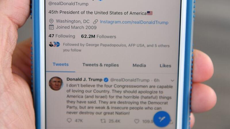 A July 21, 2019 photo of a cell phone showing the Twitter page of US President Donald Trump in Morristown, New Jersey. Trump renewed his attack on four Democratic congresswomen. MANDEL NGAN / AFP