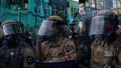 Washington National Guard personnel face off with demonstrators near the Seattle Police Departments East Precinct on June 6, 2020 in Seattle, Washington. This is the 12th day of protests since George Floyd died in Minneapolis police custody on May 25. David Ryder/Getty Images/AFP David Ryder / GETTY IMAGES NORTH AMERICA / Getty Images via AFP