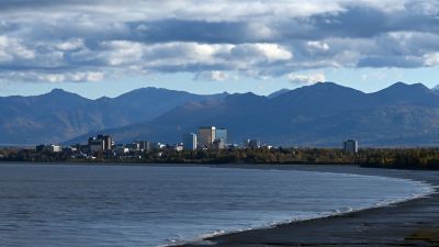 Clouds linger above the Chugach Mountains and downtown Anchorage as seen from across the waters of the Knik Arm at Earthquake Park in Anchorage, Alaska. (Photo by Patrick T. FALLON / AFP)