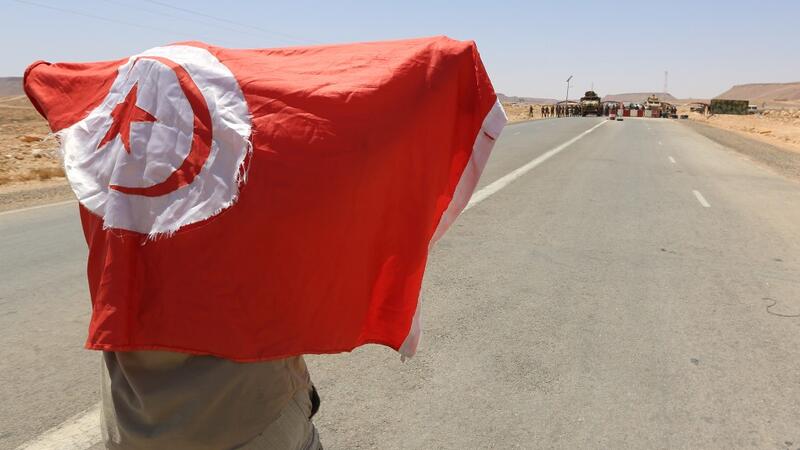 A man waves a national flag in front of Tunisian army soldiers gathered on July 12, 2020, at the border post with neighbouring Libya near the southern town of Dehiba, during a protest by Tunisians expressing their anger after the death earlier this week of a young man who according to demonstrators was killed by the military,  FATHI NASRI / AFP