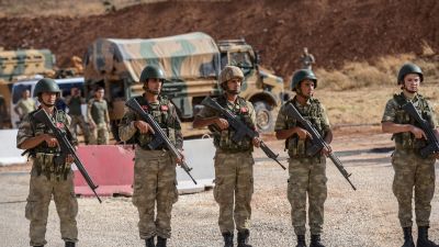 Turkish soldiers stand near armored vehicles near the Turkey-Syria border. (Ilyas Akengin/AFP)