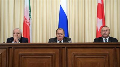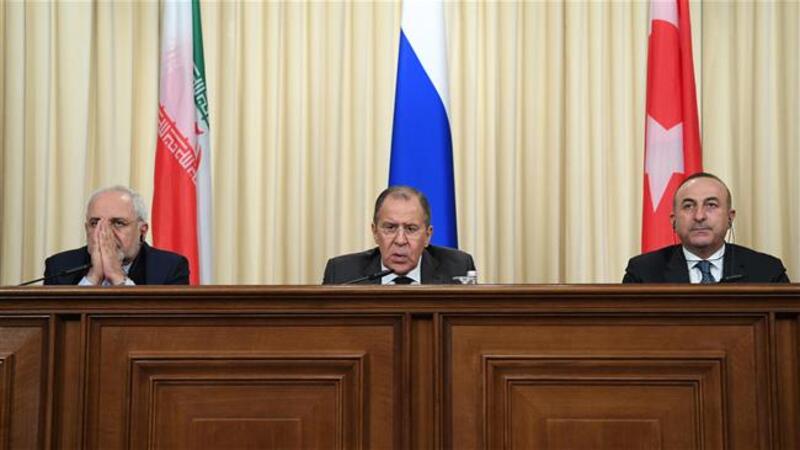 Iranian, Russian and Turkish foreign ministers, Mohammad Javad Zarif, Sergei Lavrov and Mevlut Cavusoglu (From L) attend a news conference in Moscow, Russia, December 20, 2016. (AFP/File)