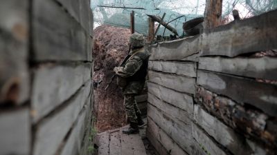 A Ukrainian serviceman stands at his position on the frontline with Russian-backed seperatists near the small city of Marinka, Donetsk region, on April 20, 2021. Aleksey Filippov / AFP