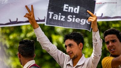 A demonstrator holds a sign reading in English "end Taiz [Taez] siege" demanding the end of a years-long blockade of the area imposed by Yemen's Huthi rebels on the Yemeni third city on May 25, 2022. (Photo by AHMAD AL-BASHA / AFP)