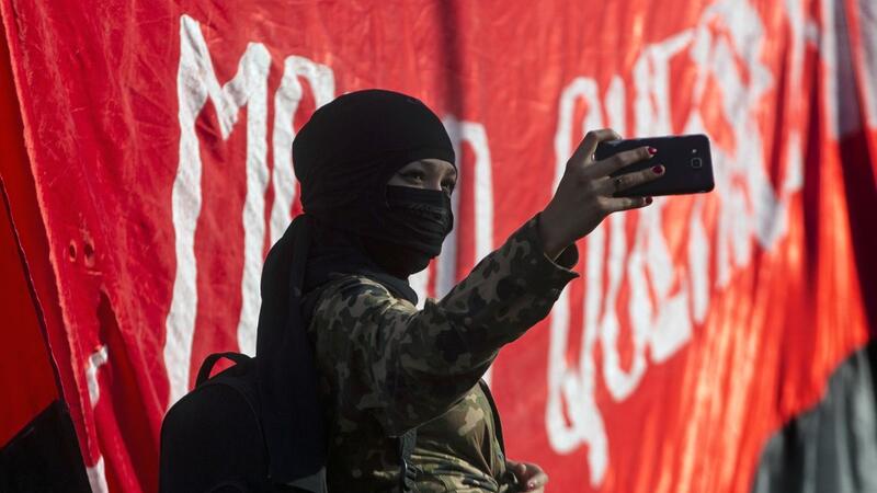 They were carrying banner featuring an eye-drawing that read "the eyes of the people accuse the terrorist state."