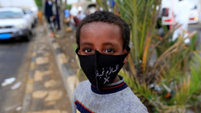 A Yemeni biy wearing a protective face mask is pictured in the capital Sanaa, during the ongoing novel coronavirus pandemic crisis, on May 21, 2020. / AFP / Mohammed HUWAIS