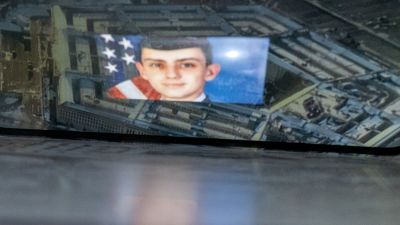 This photo illustration created on April 13, 2023, shows the suspect, national guardsman Jack Teixeira, reflected in an image of the Pentagon in Washington, DC. (Photo by Stefani REYNOLDS / AFP)