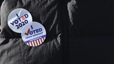 A member of the "Democrats Abroad" organisation wears an "I voted 2020" sticker during a demonstration near the US embassy in Berlin on November 4, 2020, as votes' counting continues in the current presidential election. The US election was plunged into chaos early Wednesday November 4, 2020, as President Donald Trump prematurely declared victory and sought Supreme Court intervention to stop vote-counting -- even as his Democratic rival Joe Biden voiced confidence in his own chances. John MACDOUGALL / AFP