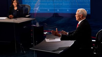 emocratic vice presidential nominee Sen. Kamala Harris (D-CA) and U.S. Vice President Mike Pence participate in the vice presidential debate at the University of Utah on October 7, 2020 in Salt Lake City, Utah. POOL / GETTY IMAGES NORTH AMERICA / Getty Images via AFP