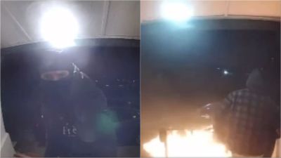 A doorbell caught the moment of two assaulters setting a mosque on fire, before it was put out by firefighters. The clip showed one person on the steps at the entrance of the mosque pouring a liquid before setting it on fire, while the other person was seen waiting at the bottom. Both men were wearing balaclavas.