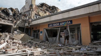 Anton, a teacher, puts Ukrainian flag at the entrance of his school destroyed as a result of a shelling in Bakhmut, Donetsk region on July 24, 2022. (Photo by Igor TKACHEV / AFP)
