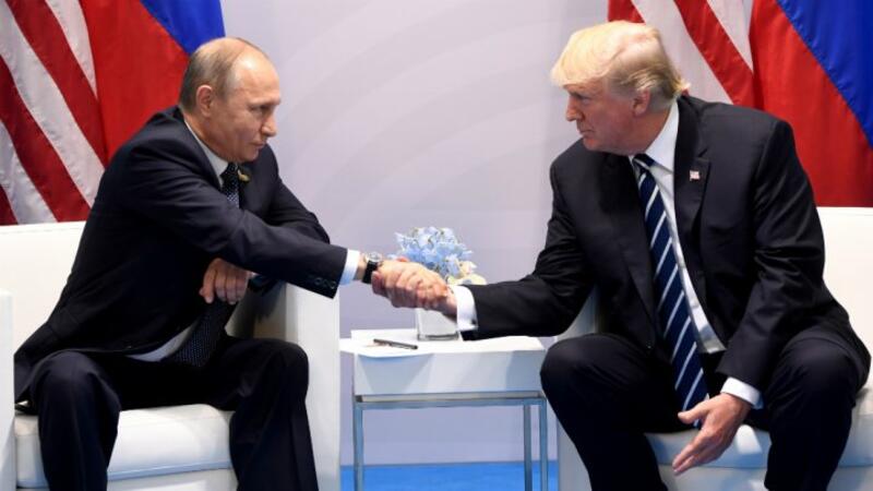 US President Donald Trump and Russia's President Vladimir Putin shake hands during a meeting on the sidelines of the G20 Summit in Hamburg, Germany, on July 7, 2017. (AFP/ Saul Loeb)
