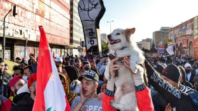An anti-government protester holds a dog up in the air next to others chanting slogans during a demonstration in the centre of Lebanon's impoverished northern port city of Tripoli on January 31, 2021. Fathi AL-MASRI / AFP