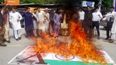Kashmiris chant slogans beside a burning Indian flag with a photograph of Indian Prime Minister Narendra Modi during a protest in Muzaffarabad, the capital of Pakistan controlled Kashmir (AFP)