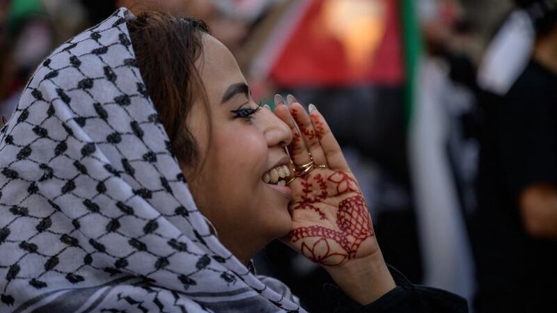 A demonstrator shouts slogans during an 'emergency rally to defend Palestine' in Manhattan, New York on June 15, 2021. Israel carried out air strikes on the Gaza Strip early June 16 after militants in the Palestinian territory sent incendiary balloons into the south of the country, in the first flare-up between the two sides since a major conflict in May in which hundreds were killed. Ed JONES / AFP