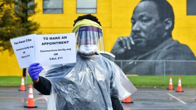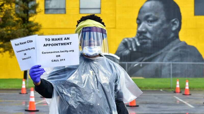 Dressed in protective gear, university student working on her master's degree Jacquelyn Augustine displays information for arranging COVID-19 testing amid the coronavirus pandemic on April 8, 2020, on the first day of testing at the Charles R. Drew University of Medicine in south Los Angeles. AFP