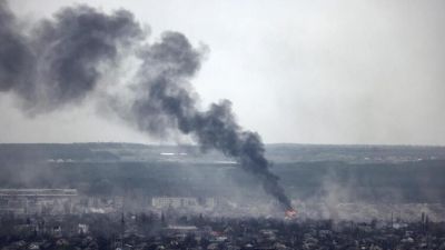 A photograph taken from Novodruzhesk village, shows dark smoke rising in Rubizhne city, on April 18, 2022, on the 54th day of the Russian invasion of Ukraine. A series of "powerful" Russian strikes on military infrastructure in Lviv on April 18, 2022, left several dead and ignited blazes in the west Ukraine city that has been spared fierce fighting. (Photo by RONALDO SCHEMIDT / AFP)