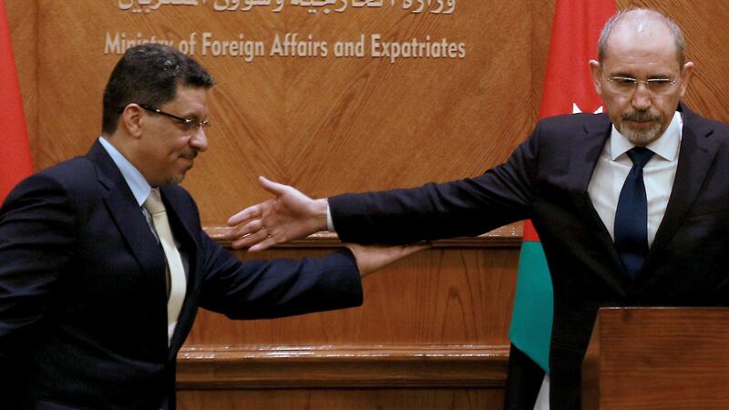 Jordanian Foreign Minister Ayman Safadi welcomes his counterpart from Yemen's internationally-recognised government, Ahmed Awad bin Mubarak (L), at the podium for a joint press conference after their meeting in Jordan's capital Amman, on August 8, 2022. (Photo by Khalil MAZRAAWI / AFP)