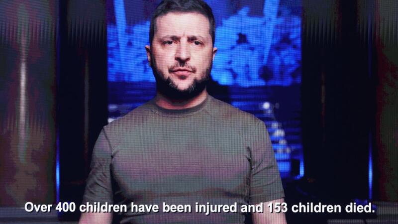 President of Ukraine Volodymyr Zelenskyy speaks on screen during the 64th Annual GRAMMY Awards at MGM Grand Garden Arena on April 03, 2022 in Las Vegas, Nevada. Rich Fury/Getty Images for The Recording Academy/AFP