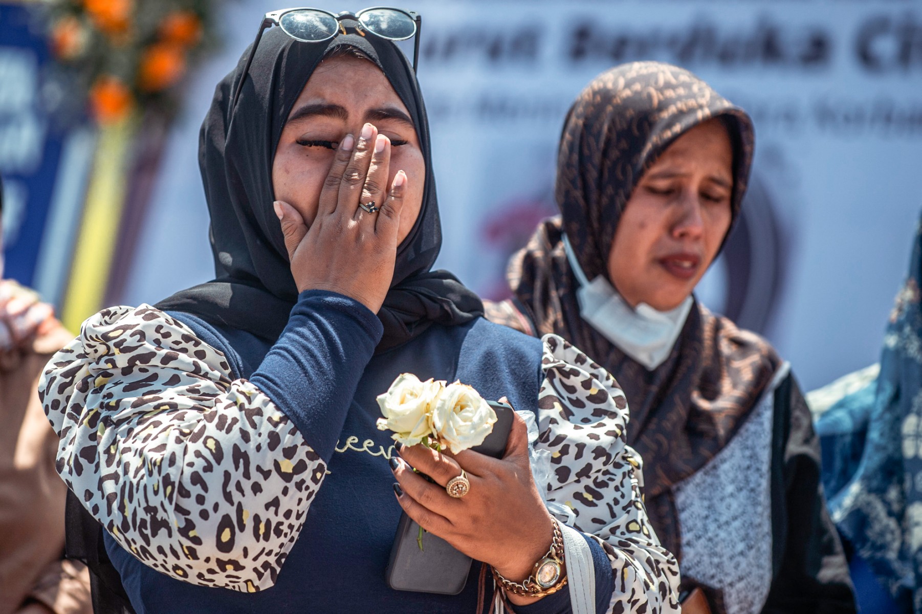 A woman reacts as people pay their respects for victims of the stampede at Kanjuruhan stadium in Malang, East Java on October 4, 2022. (Photo by JUNI KRISWANTO / AFP)