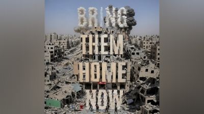 In the photo, a building is seen being bombed with the words "Bring Them Home Now" can be read after being caused by bomb dust.