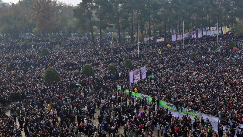 In this file photo taken on November 19, 2021, Iranians gather during a protest to voice their anger after their province's lifeblood river dried up due to drought and diversion, in the central city of Isfahan. (Fatmeh Nasr / ISNA / AFP)