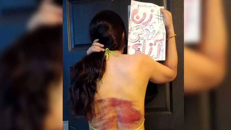 ALBAWABA - Activists on social media circulated a photo showing a woman holding a banner reading "زن، زندگی، آزادی (which means: Women, Life, Freedom)" slogan with her back filled with red scars.