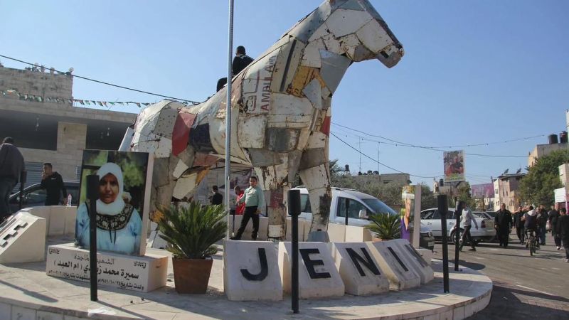 An old photo of the statue was shared showing a horse statue created by the remains of destroyed ambulance vehicles in Jenin.