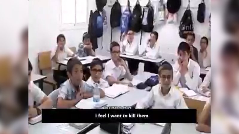 The teacher then asks about what the kids feel when they meet "an Arab", and their responses vary between "Angry, I feel I want to kill them". She follows up with a question about how they feel when meeting a "non-religious Jewish kid" and they answer "We feel sorry for him. He isn't taking the right path".