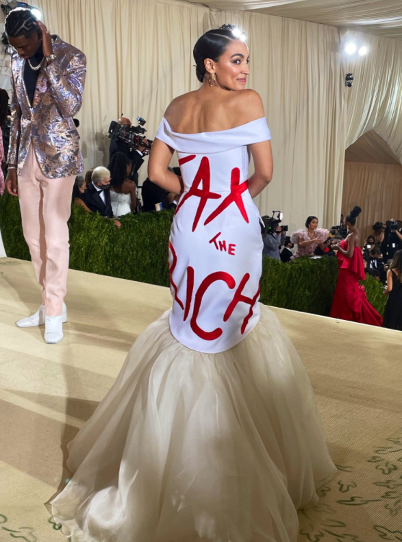 Another congresswoman seized the moment and wore a political gown for the 2021 Met Gala. NY rep Alexandria Ocasio-Cortez expressed her social capitalist views with a big red "Tax the Rich" phrase printed over her white dress.