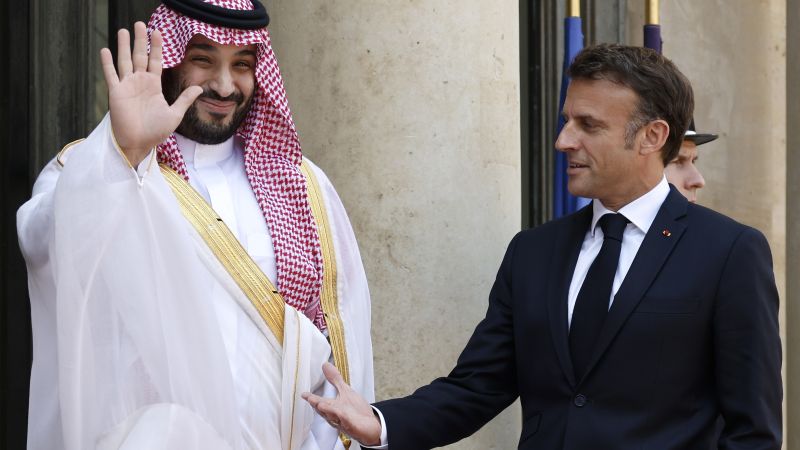 France's President Emmanuel Macron greets Saudi Crown Prince Mohammed bin Salman as he arrives at presidential Elysee Palace in Paris, on June 16, 2023. (Photo by Ludovic MARIN / AFP)