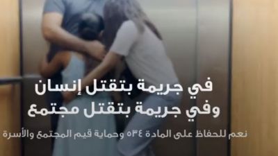 Slogans appear on the screen reading: "There's a crime that kills a human, while there's a crime that kills a community." "Yes to keep law number 534 and protect the Lebanese family and community's values."