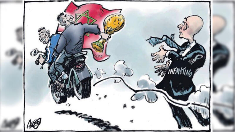 The cartoon in Netherland's De Volkskrant newspaper showed two characters, waiving the Moroccan flag on a speeding motorcycle, while stealing the World Cup trophy from the hands of FIFA President Gianni Infantino.