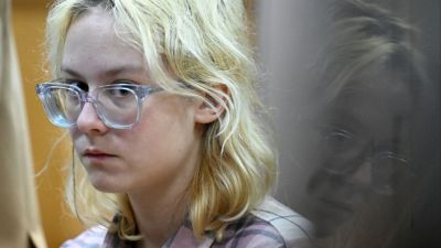 Diana Loginova, the-18-year-old music student, street musician and lead singer of the Stoptime band known by the stage name Naoko, who was earlier arrested after her performances of songs by exiled Russian artists known for their opposition to the the country's military campaign in Ukraine, and served two short jail terms for "disrupting public order" and "petty hooliganism", appears in court over new public order charges in Saint Petersburg on November 11, 2025. (Photo by OLGA MALTSEVA / AFP)