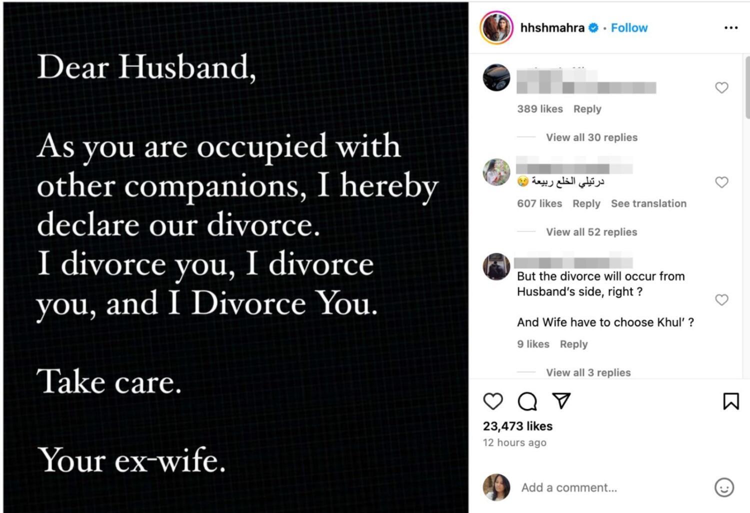 In an Instagram post yesterday, Sheikha Mahra declared her divorce, repeating it three times. She wrote: "Dear Husband, As you are occupied with other companions, I hereby declare our divorce."