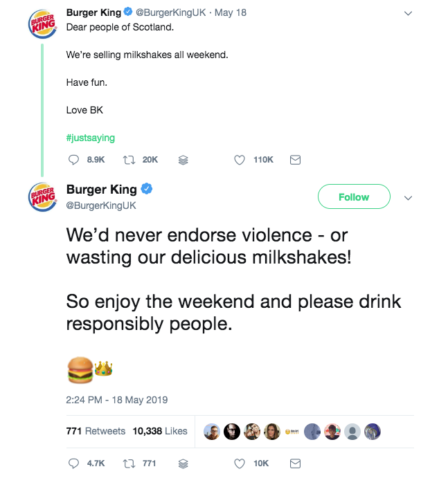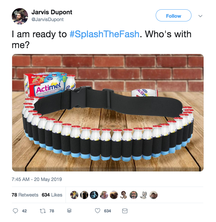 Several parody accounts and corporate accounts also got involved, including an ironic call to arms and several attempts to riff of the trending "Milkshake" hashtag.