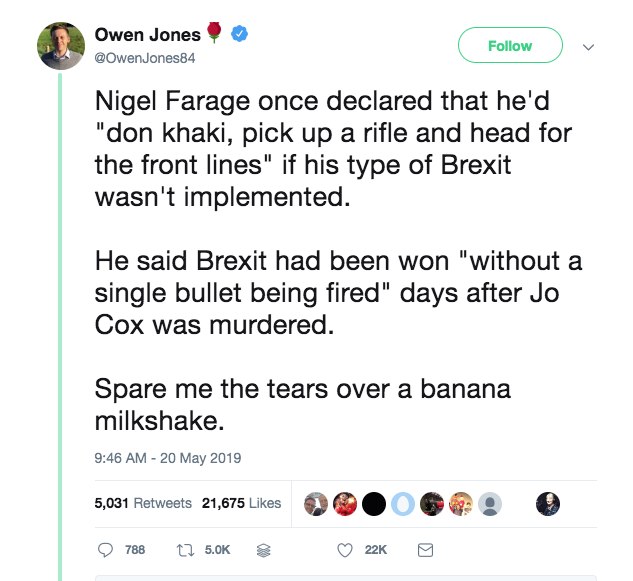 According to the Sun a hipster Corbynista "lobbed" a premium salted caramel milkshake at Mr. Farage, who was campaigning in Newcastle on the 20th of May. The Brexit party leader responded that the shake was "yobbo flavored" and later posted a picture reading "Whatever they throw at us they will never give up."