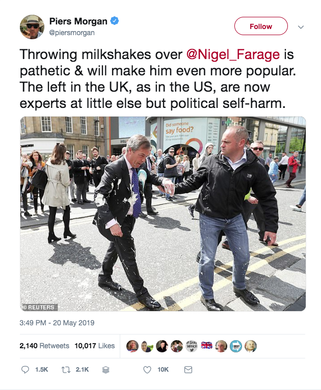 Earlier this week Nigel Farage, the leader of the surging 'BREXIT Party' in the United Kingdom was attacked with a milkshake - technically classed as an assault under British Common Law. Legal arguments aside, media and twitter culture seems to be divided about the incident. As so often, the arguments for and against are divided along ideological lines.