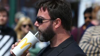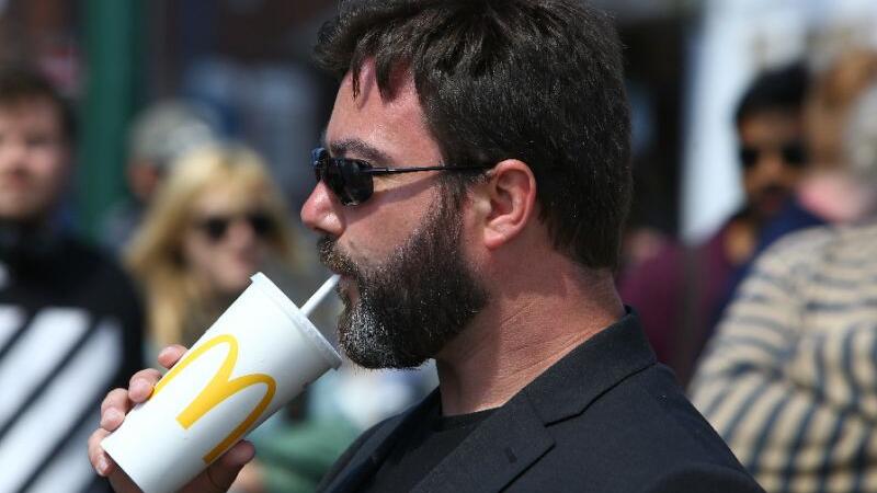 UKIP European Parliament candidate Carl Benjamin, who has had milkshakes thrown at him at least four times this month, made a show of sipping on a McDonald's milkshake at one of his events this week (AFP Photo