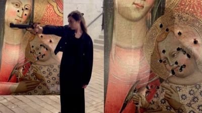 A picture was posted by Sanija Ameti on X account (formerly Twitter) showing herself holding a gun with a photo of the Virgin Mary and baby Jesus filled with gunshots in the head and bodies.